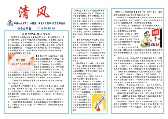 为深入贯彻落实“两学一做”学习教育,进一步增强党员干部责任意识,近日,郑州市东三环107辅道快速化工程PPP产品总承包部结合案例故事学习《中国共产党问责条例》。