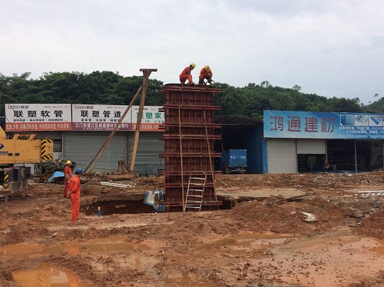 近日,江门大道配套道路工程迎宾西路产品人行天桥首件墩柱浇筑完成。
